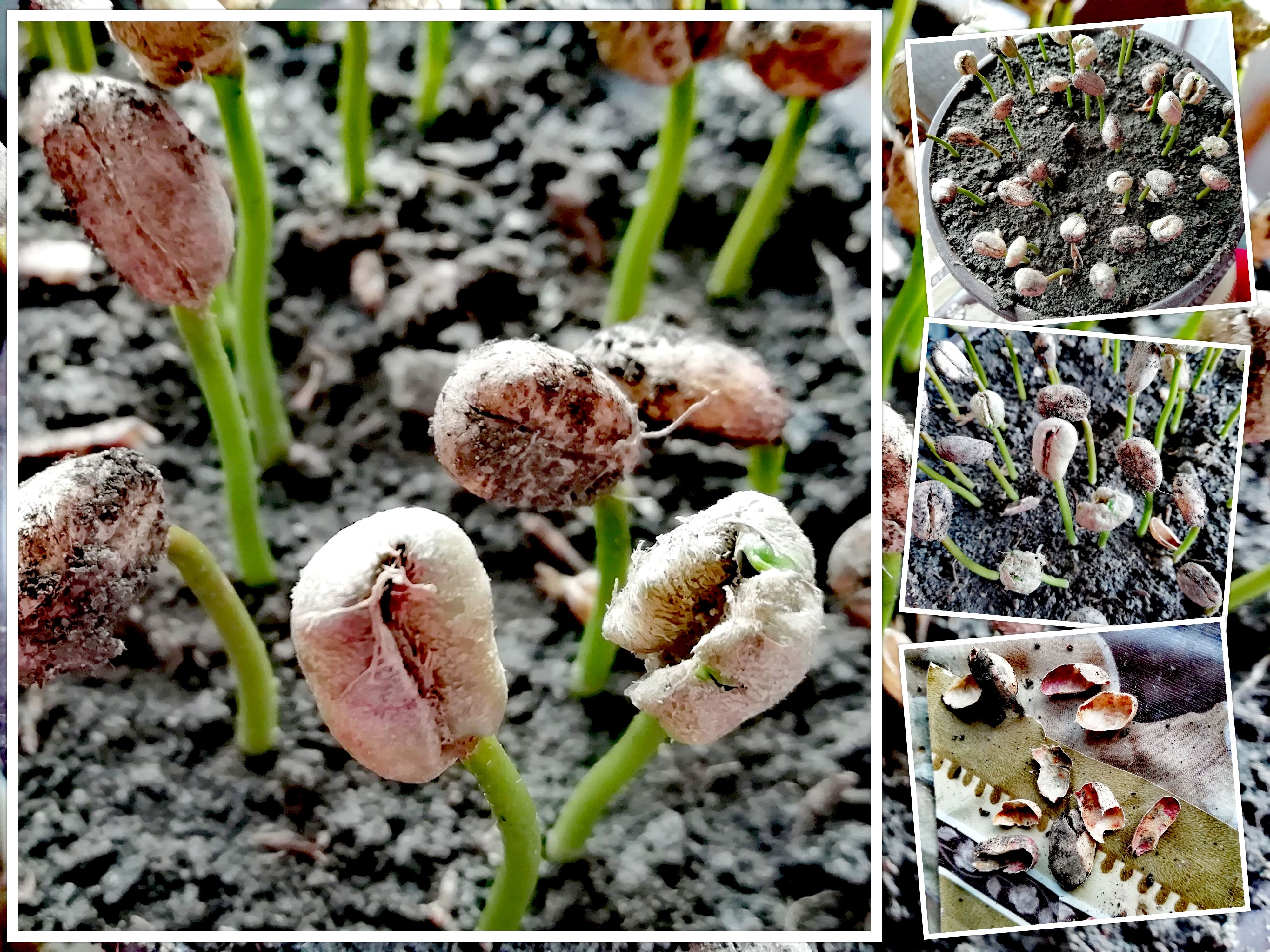 After month you have this comical plant, basically a seedling with a bean stuck on top. The bean softens and expands to for the first leaves
